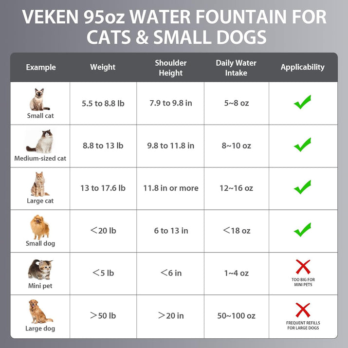 This automatic water dispenser is designed to meet the hydration needs of both cats and dogs. With its 95oz capacity, it provides ample water supply, encouraging hydration for pets of all sizes and making it a versatile choice for multi-pet households.